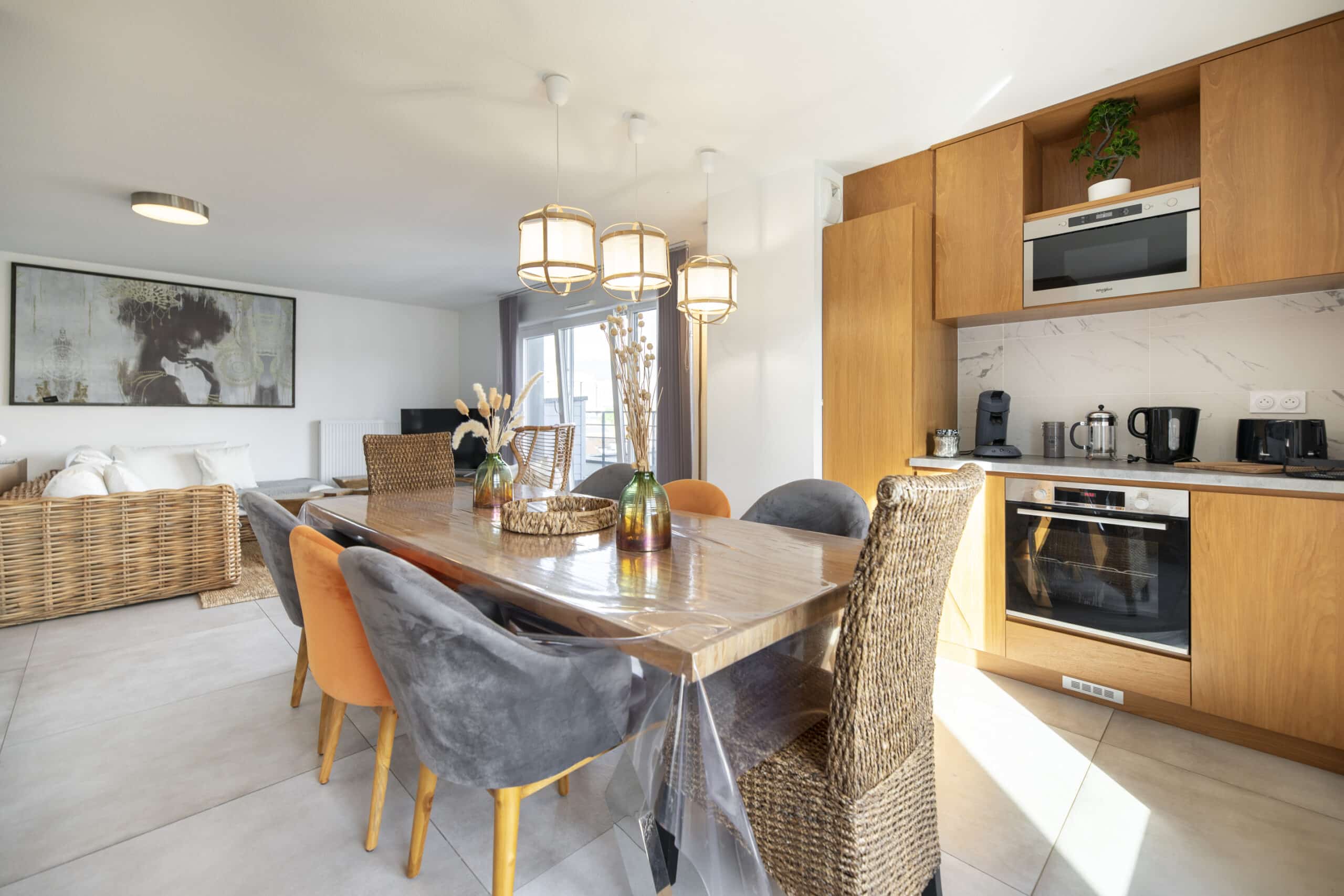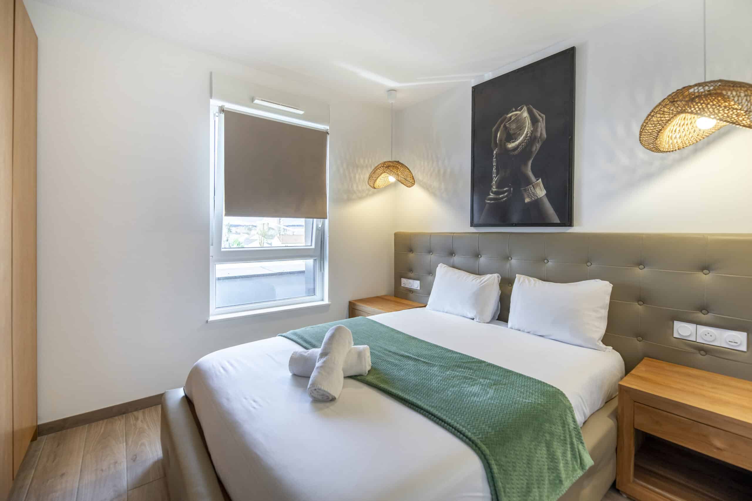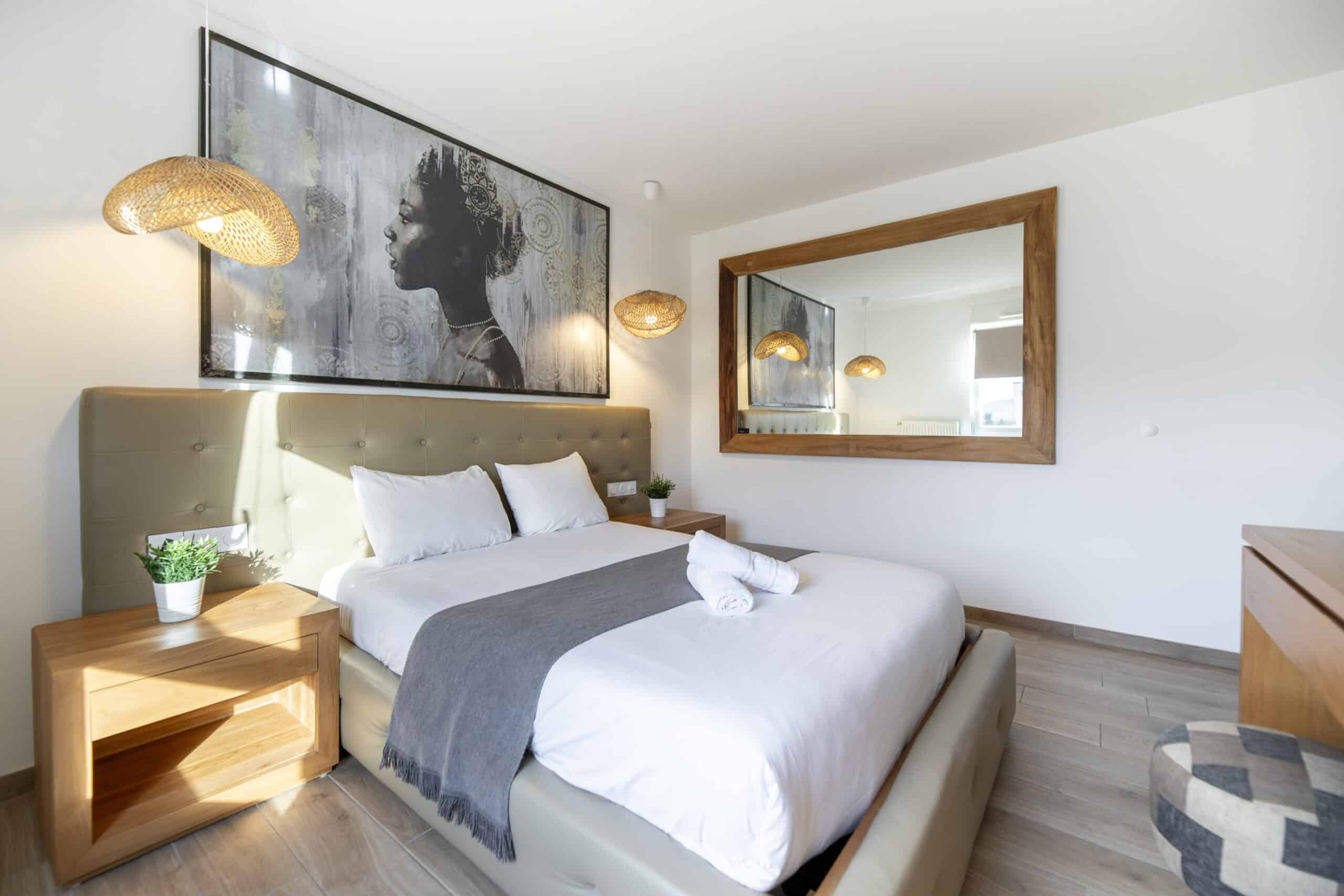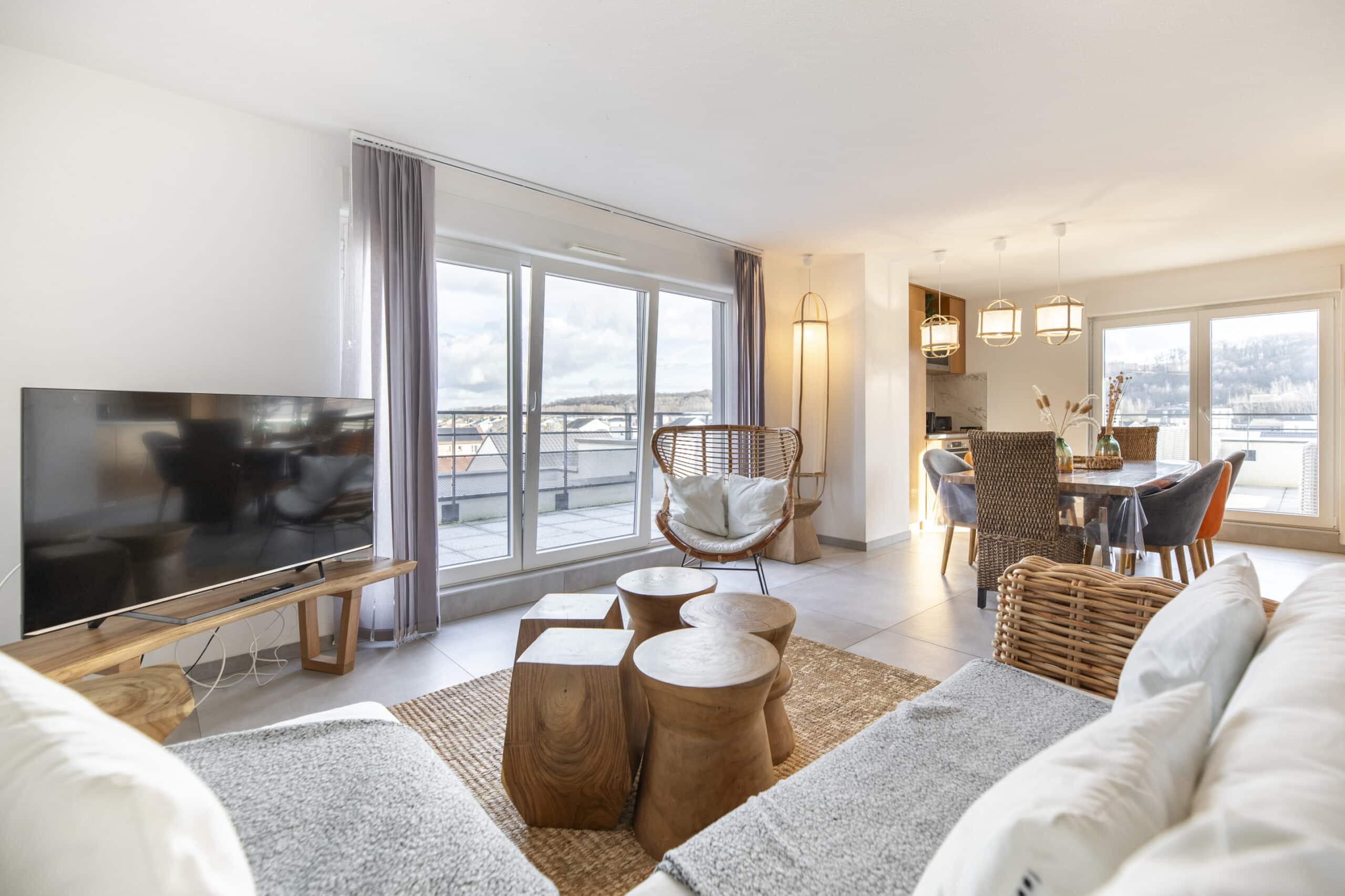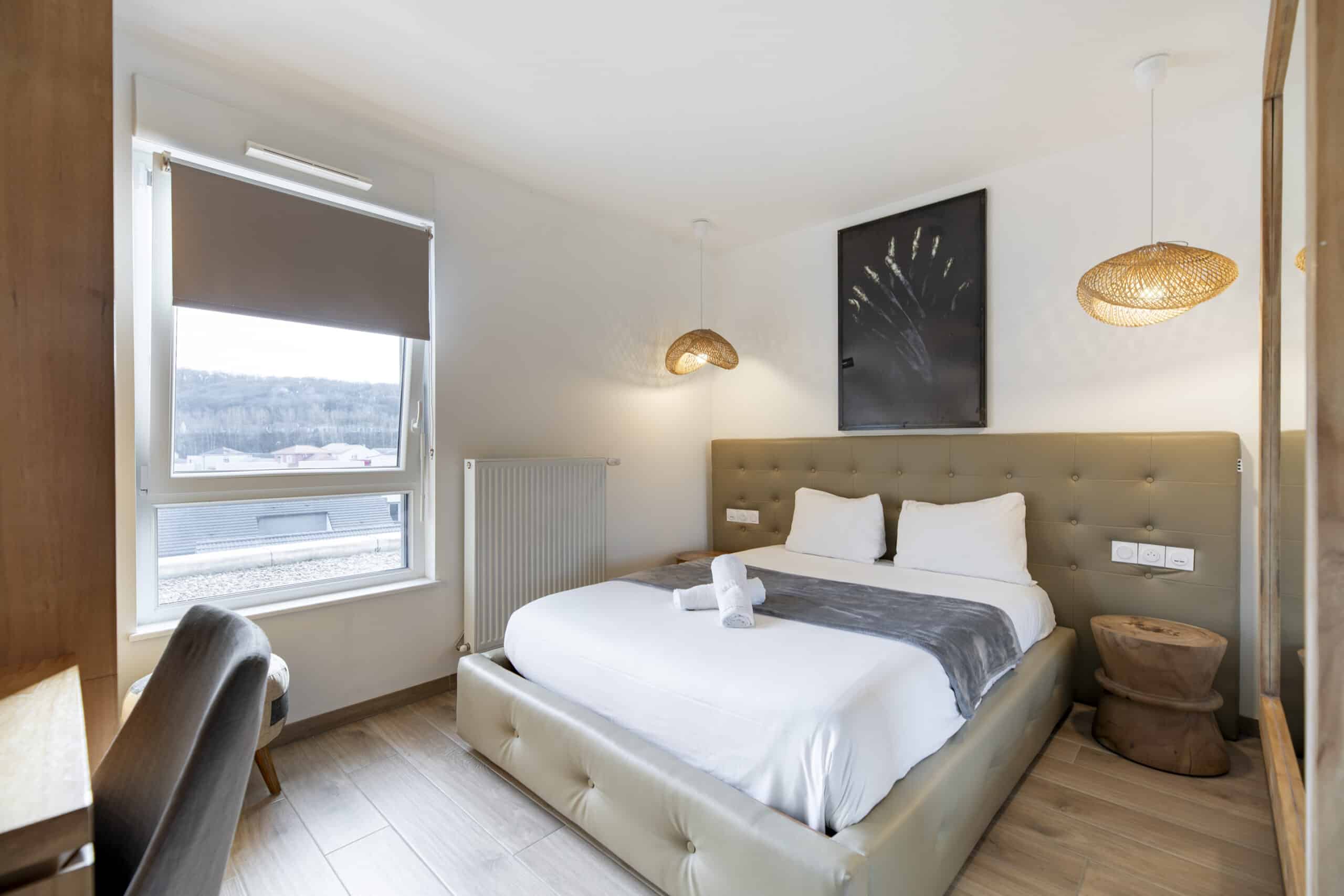3 chambres spacieuses dont deux avec télévision, salle de douche confortable, une immense terrasse d’angle équipée d’un salon extérieur avec vue panoramique sur la ville et la forêt.