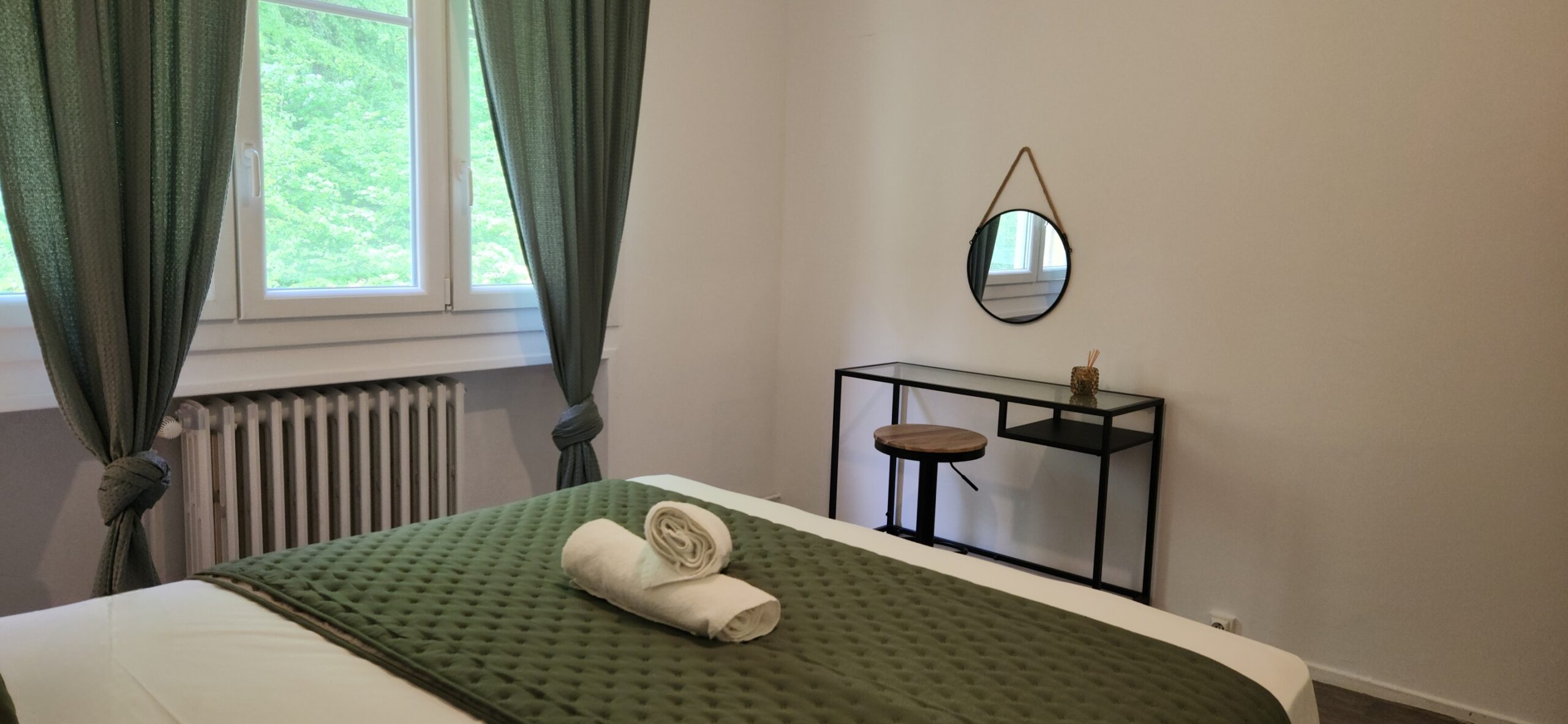 Notre bel appartement T3 Le Grand Cerf, comprenant deux chambres spacieuses avec vue côté forêt, vous accueille dans une ambiance décontractée. Il est situé dans l’immeuble  d’une petite résidence au 2ème étage sans ascenseur.  Idéal pour des vacances  » au vert  » avec calme et sérénité.